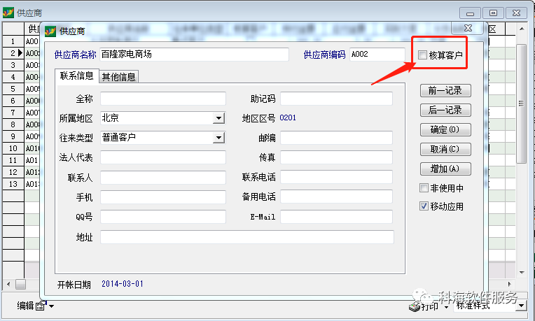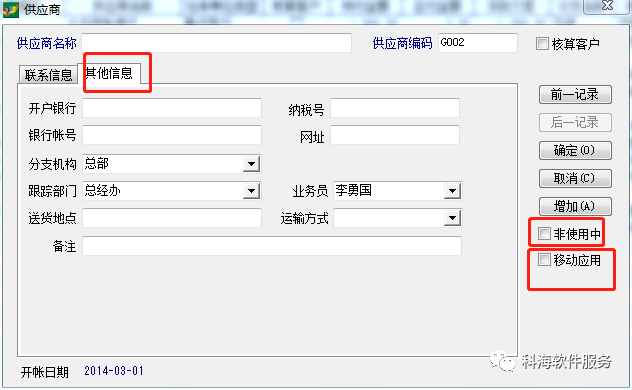 同時(shí),我們看到供應(yīng)商的分類信息不但有全稱,也可以助記碼,在輸入查詢時(shí)可以簡單輸入首寫字母就可以模糊查詢供應(yīng)商資料,二是按地區(qū)分類,這樣可以分析出區(qū)域客戶的各種數(shù)據(jù)。第三是供應(yīng)商的所有明細(xì)資料,包括地址、手機(jī)、座機(jī)、QQ號(hào)等等。右側(cè)的非使用是指客戶長期不往來,就可以從供應(yīng)商信息里不進(jìn)行核算等操作時(shí),將此勾選,移動(dòng)應(yīng)用是指軟件支持手機(jī)應(yīng)用,選擇上可以實(shí)現(xiàn)手機(jī)端的查詢和操作。