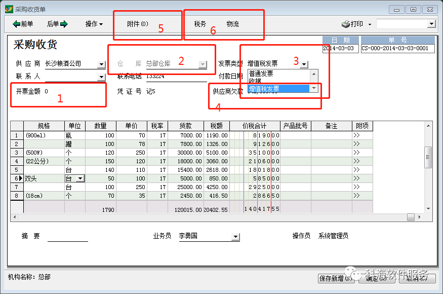 收貨單進(jìn)行錄入供應(yīng)商的收貨單時(shí),可以看到1.開票的金額,說明此收貨單是含發(fā)票的。2.所出倉庫,說明此貨入哪個(gè)倉庫。3.發(fā)票類型,可以支持3種類型,這是我們熟悉的專票,普票,和收據(jù)。4.還可以顯示出供應(yīng)商的欠款數(shù)據(jù)。方便適時(shí)掌控欠款額。5.可以看來所帶來的原始附件,保證票據(jù)的完整和可靠。6.稅務(wù)信息是開票的重要部分,速達(dá)軟件同樣支持各大物流的信息與貨品的信息打通 。當(dāng)然還不許多重要信息,如:日期,可以提前做收貨當(dāng)然不可能,但有些時(shí)候可以延后處理收貨單也是可能的。操作里的內(nèi)容也很多,是符合現(xiàn)代企業(yè)的許多需求,提供了非常方便的操作。打印收貨單也是有必要的。
